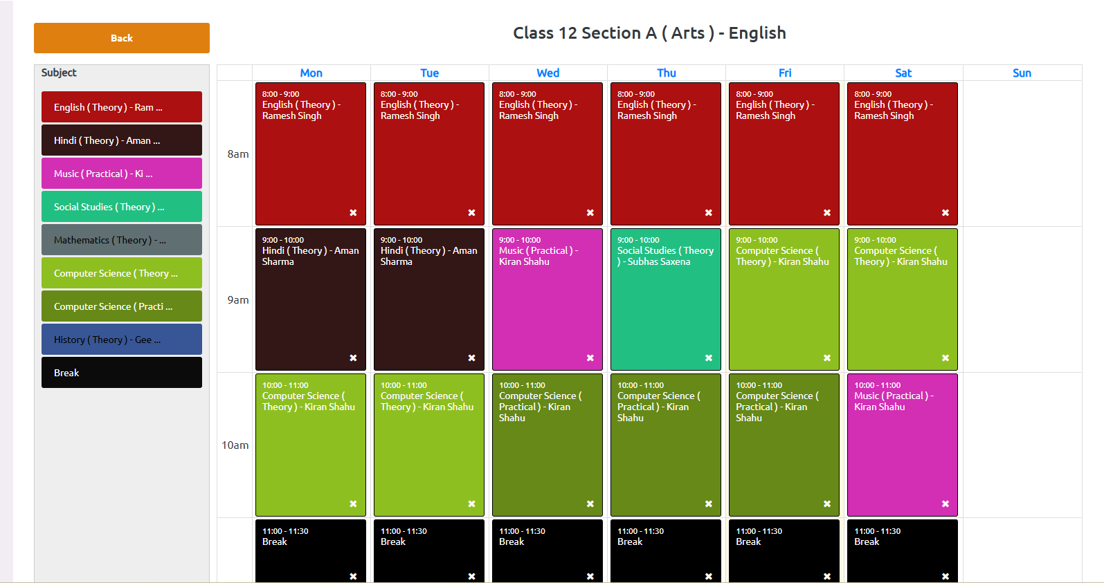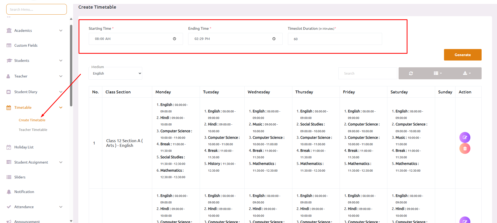 For creating timetable of any class, admin has to edit class timetable here then drag and drop subjects.