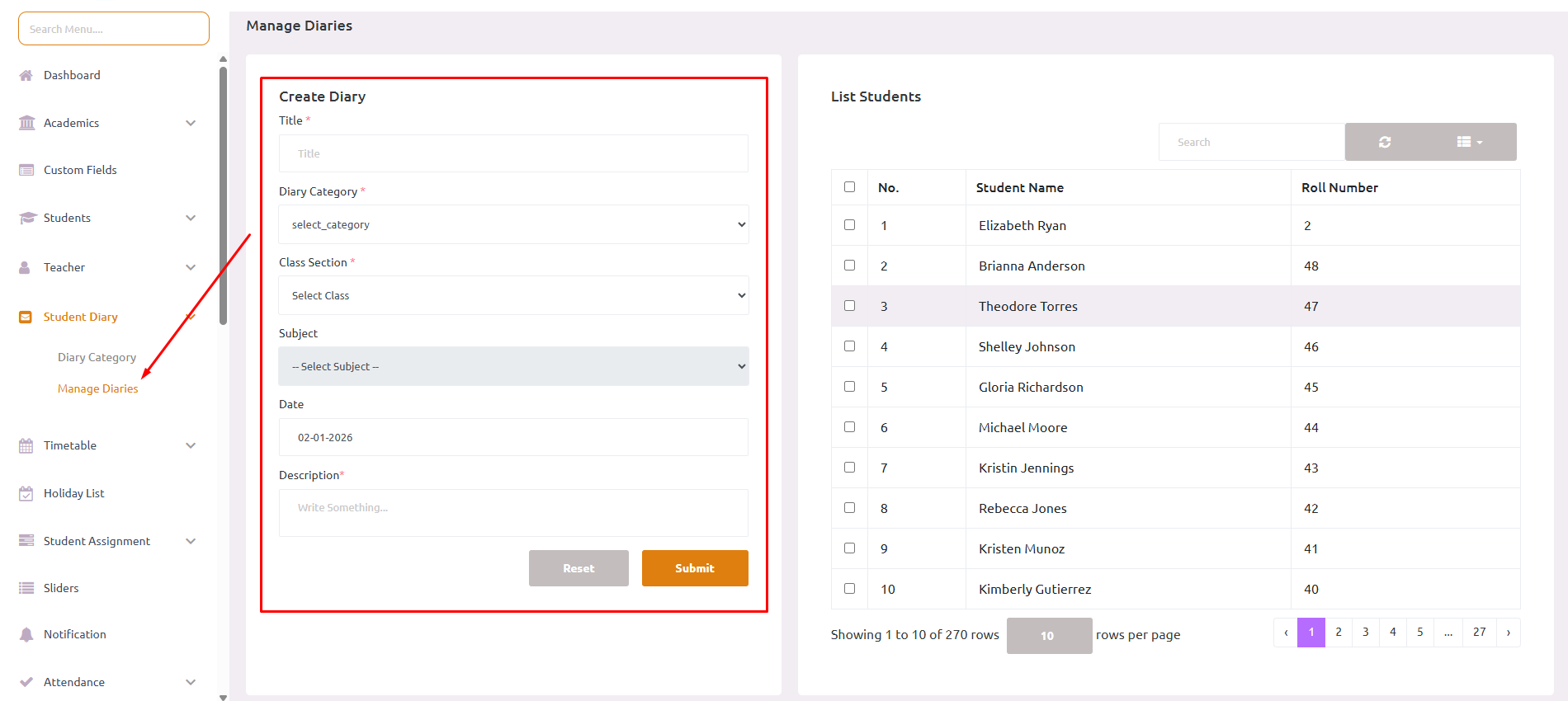 1. Go to the Diary section in the admin/teacher panel