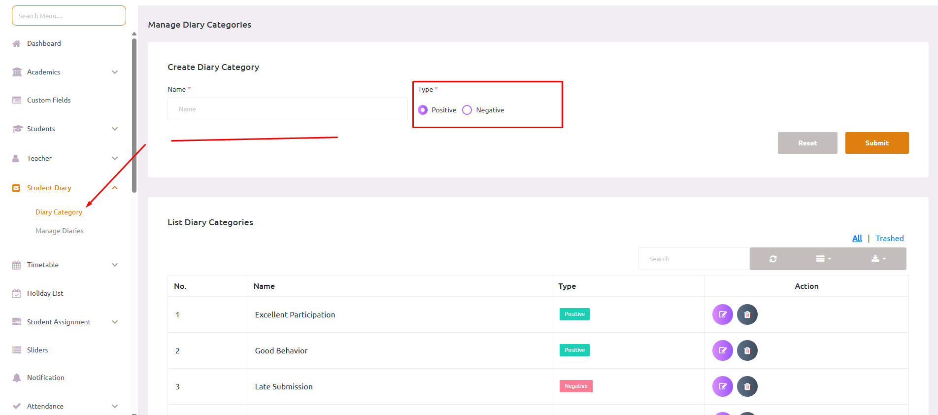 Before creating diary entries, you must first set up diary categories in the admin panel. Categories help organize diary entries and can be marked as positive or negative.