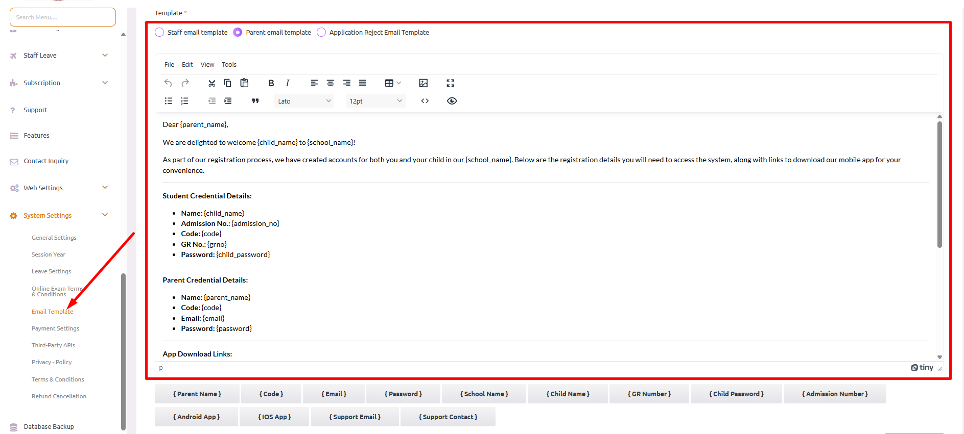 A school admin can create custom email templates for registering new students, staff, and teachers. This template includes credentials, key information, and any additional notes. The system will use the predefined format to send emails to new users, ensuring consistent communication and easy access to important details.