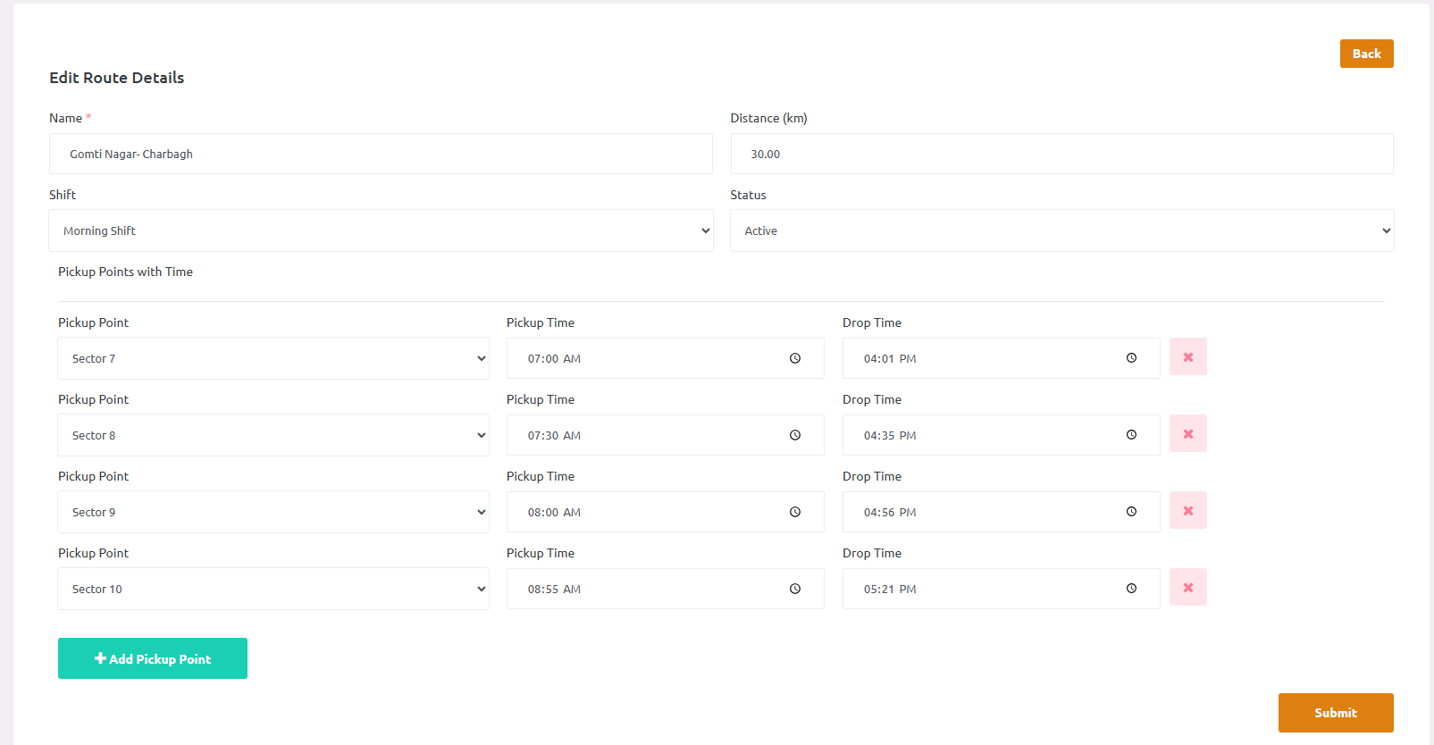 - Name: Enter the route name (e.g., “Sector 7- Sector 10)