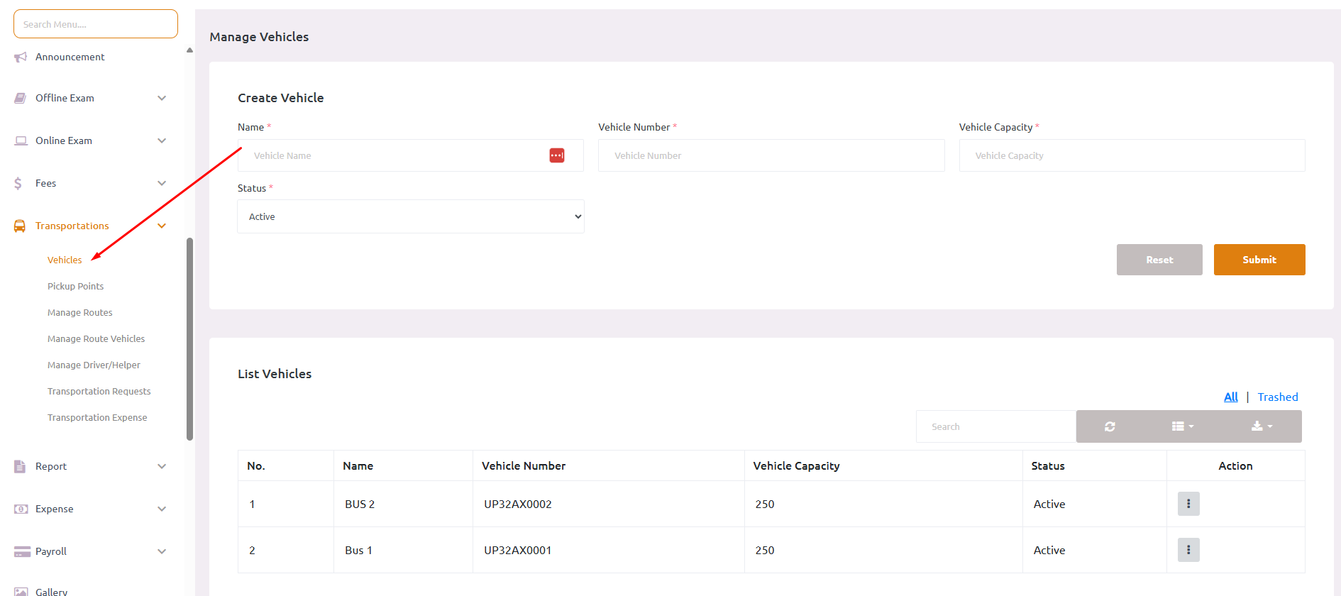 - Navigate to Transportations > Vehicles from the sidebar menu