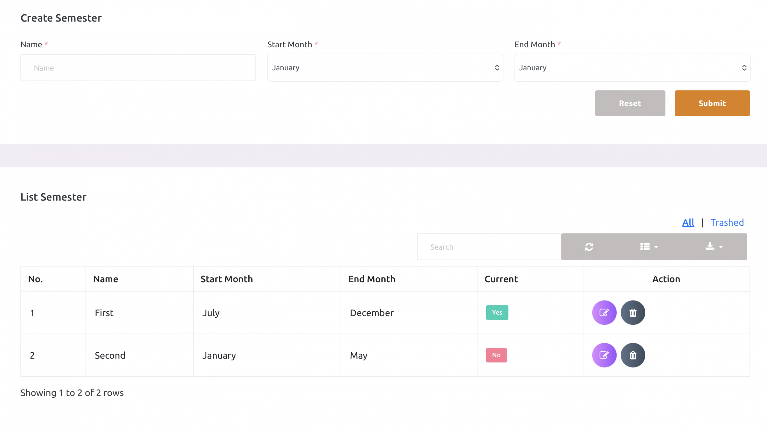 School admin can manage semesters here. Months occupied in any one semester should not be used in another semester.