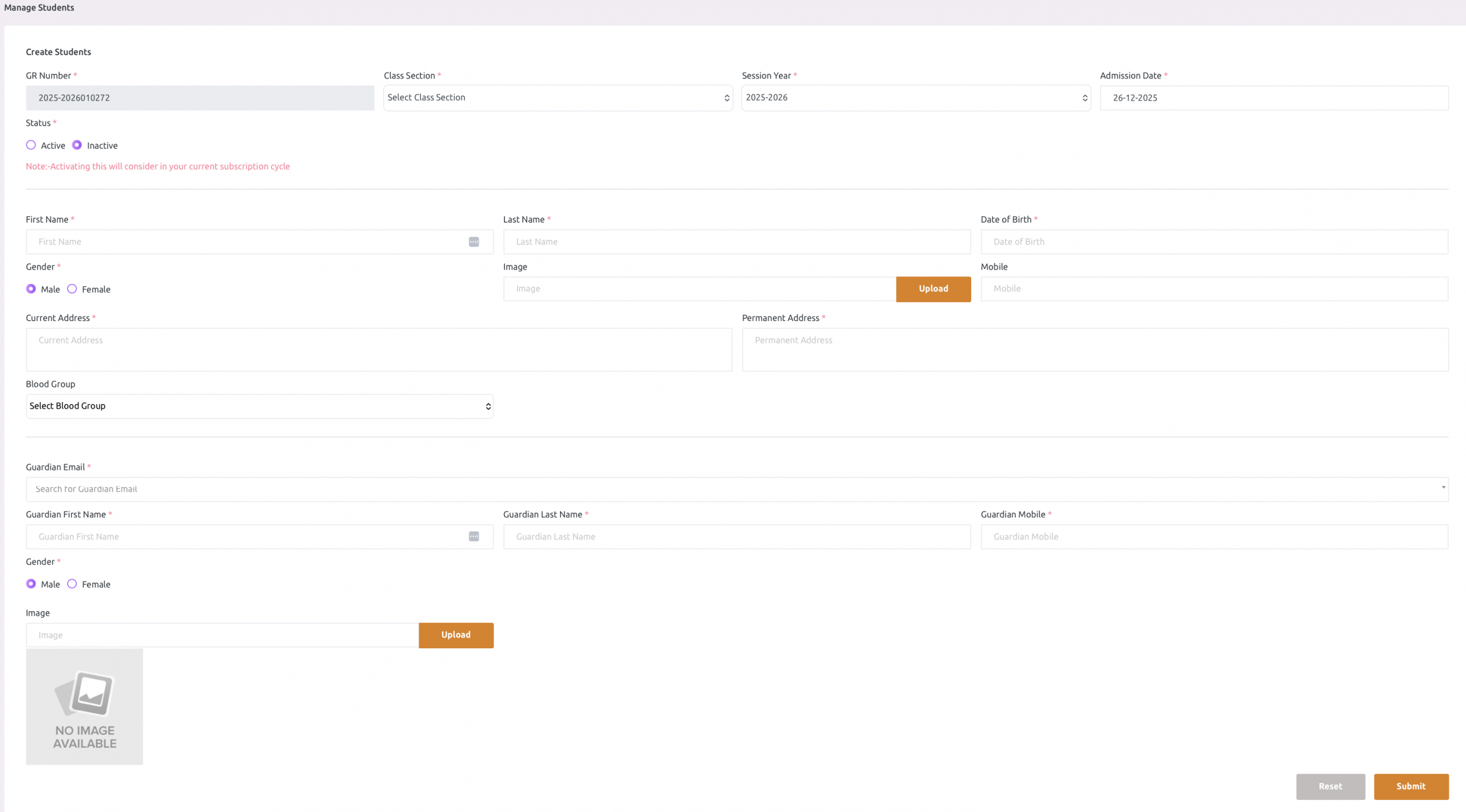 At the time of adding a new student, school admin can search for guardians by email and assign them to the newly added student. If there is no guardian with the searched email, the school admin can create a new guardian along with the student.